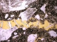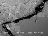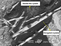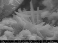 一旦反應被激活可以沿著混 凝土的裂縫看到粗糙長晶體 和細小針狀晶體的生成。晶 體完全封堵住裂縫,降低混 凝土滲透性,提供防水保護 | BEI拍攝的與上圖相同 裂縫表明澎內傳系統(tǒng) 生成晶體正在密封該裂縫 | 放大的圖片清楚地顯示 裂縫中的粗糙長晶體 和細小針狀晶體 | 放大10,000倍后可以看到 這些晶體是怎么形成的 |